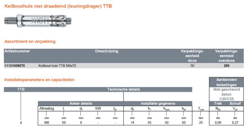 Technitec thread bolt is de originele keilbout met draadeind uit de professionele range met 4 delige expansie welke veel toegepast wordt als leuningdrager.