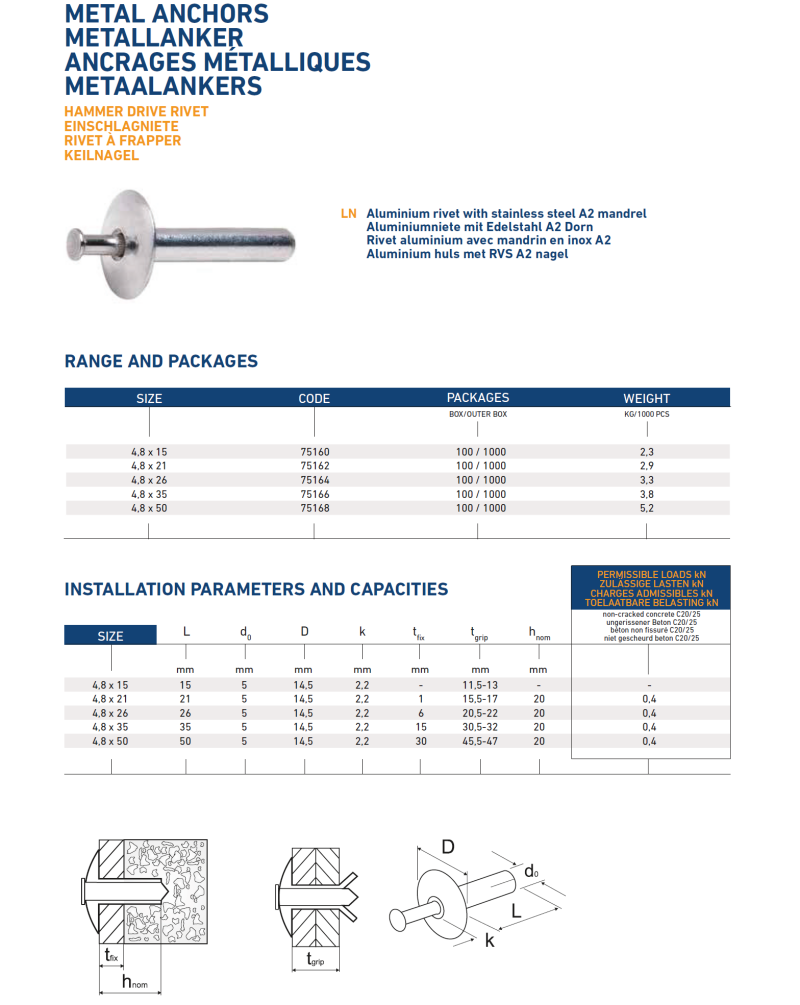 Keilnagels LN zijn uitgevoerd in Aluminium / RVS 304 (A2).